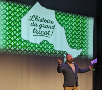 Le conteur Stéphane Guertin a tricoté un conte à propos d’un mouton vert et blanc qui mène le troupeau pour illustrer le côté rassembleur du projet «50 ans de fierté! Ensemble pour demain».